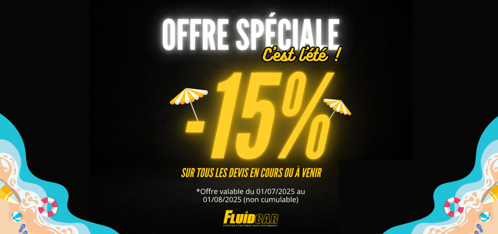A la demande générale et pour fêter l’arrivée fulgurante de l’été, FLUIDCAR vous offre exceptionnellement une réduction de -15 %* sur tous les devis signés entre le 1er juillet et le 1er août 2025.