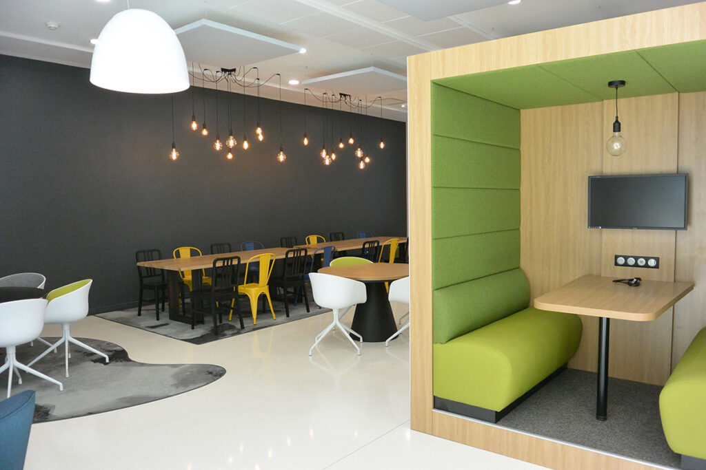 Pour le restaurant d’entreprise de la société Safran, nous avons choisi la variété et la modernité. De longues tablées, des tables rondes, un coin lounge avec un canapé, une petite cabane… le tout avec des matériaux de qualité, ultra design et de jolies couleurs. Ces bureaux ont tout pour plaire !