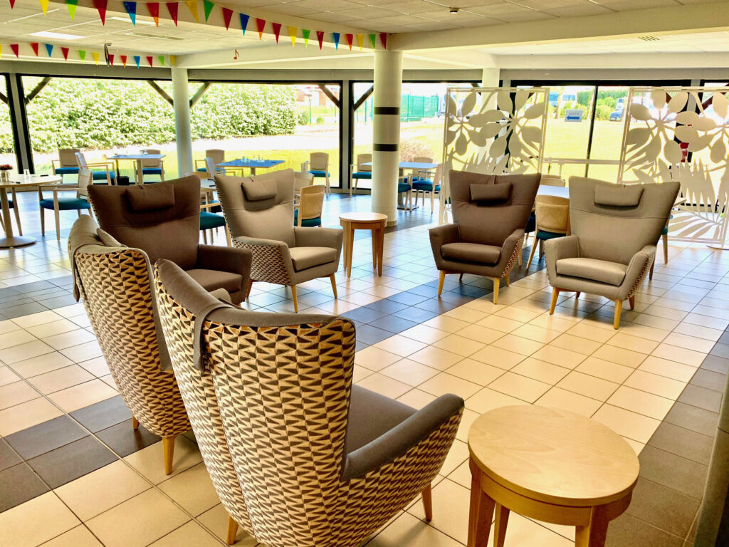 Pour égayer l’EHPAD La Sainte Famille à Marquise dans le Nord de la France, nous avons fait le choix de couleurs pétillantes et de revêtements distinctifs. Fauteuils, bridges, canapés et fauteuils de repos confortables et design sont autant de sièges que vous pourrez retrouver dans cette maison de retraite.