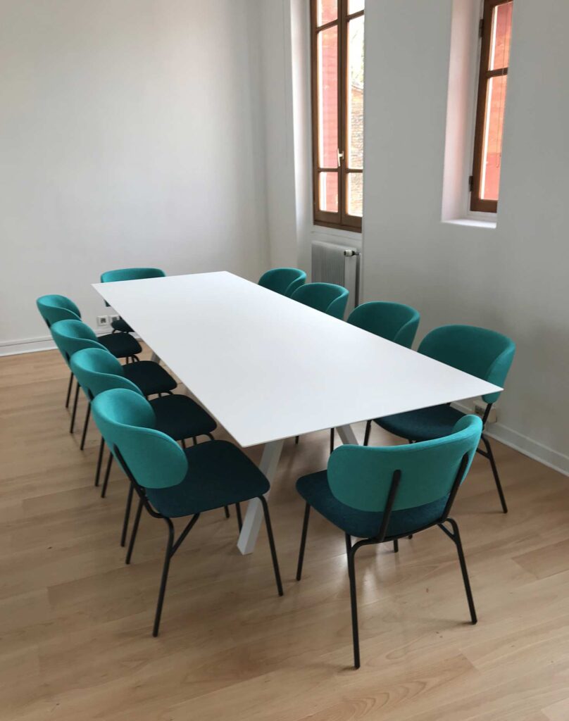 Pour cette salle de réunion à la mairie de Montrabé, près de Toulouse, nous avons proposé du mobilier design, moderne et confortable. La table KAIR et ses pieds chevalet en acier est polyvalente pour s’adapter à différents types d’utilisation. Les chaises JULIETTE bicolores apportent la touche en plus qui fait toute la différence !