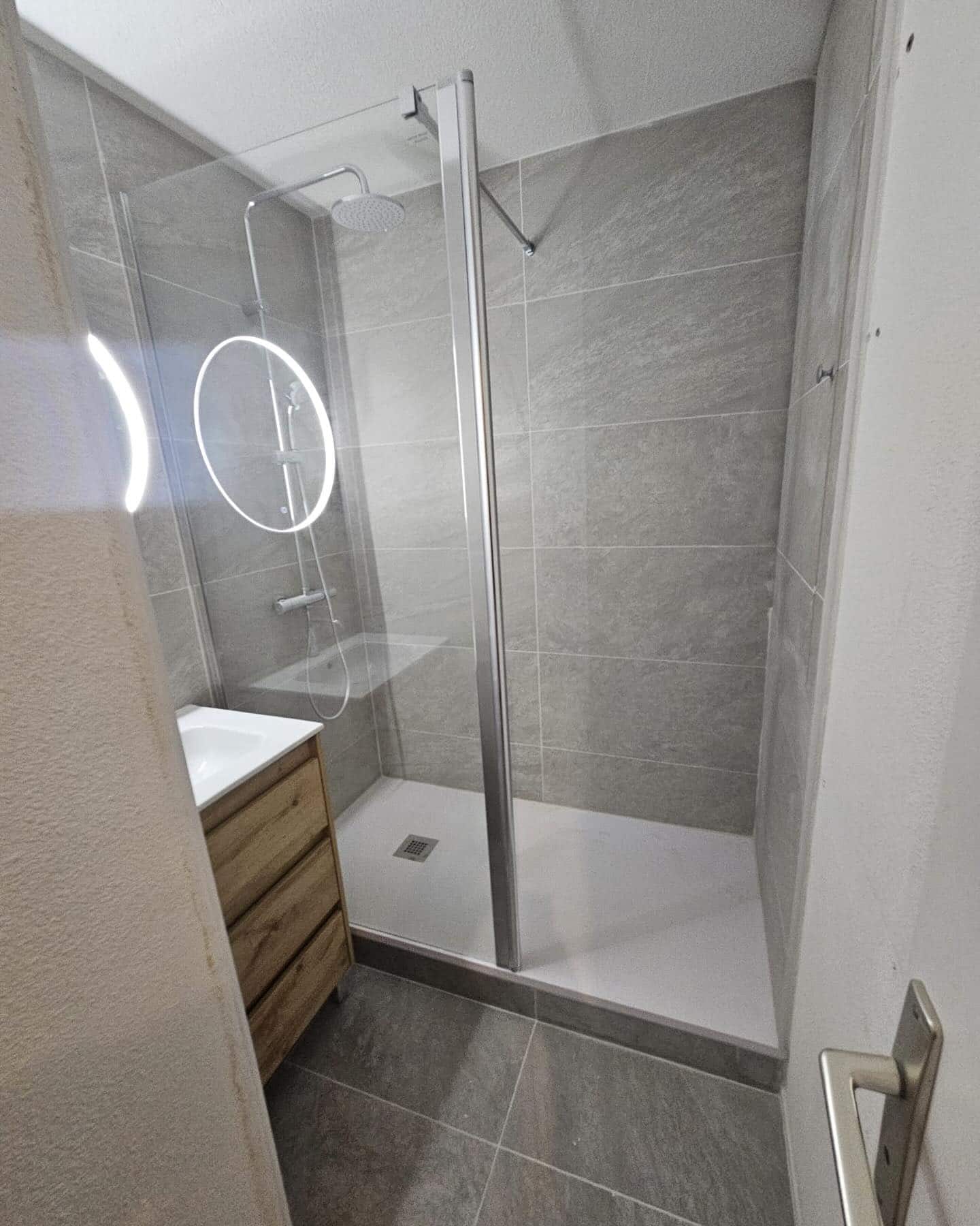 L’ancienne baignoire a été remplacée par une douche spacieuse et élégante, avec des matériaux de qualité et un agencement optimisé.